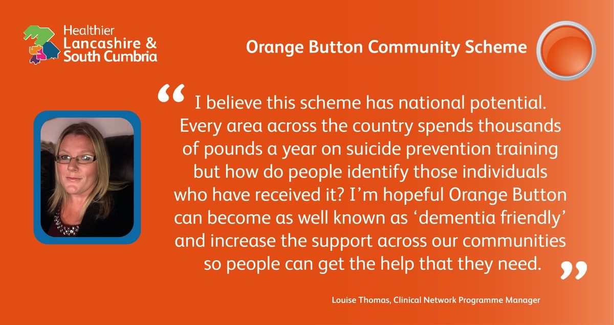 The orange button is worn by people in Lancashire and South Cumbria who have undergone specialised suicide prevention training, and while they are not able to counsel people, they can provide comprehensive signposting to relevant services.